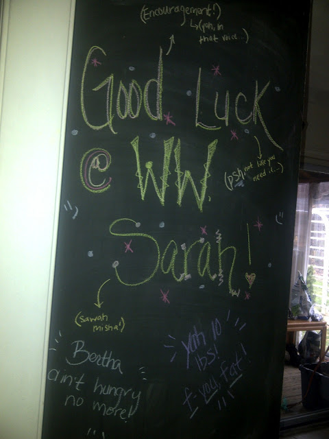 I wanted to share with all of you what I was surprised with this morning on my way out the door to the Weight Watchers meeting. Kristi, my fiancee, and I live with our friend Heidi in her house. Heidi is also one of my bridesmaids. As I said in a previous post, Heidi is also doing Weight Watchers, and is very supportive and a great inspiration for me, especially with her fancy cooking ideas sometimes! This morning she surprised me by leaving a great big inspirational message on a wall of her kitchen that she made into a chalk board. This psyched me up for the meeting and certainly started my day off well. She knew my goal today was to hit 10 pounds and while I didn't do it, seeing this really made my day! I wanted to share with everyone, and to say THANK YOU HEIDI for your friendship and your support! I should mention that she also put a piece of Press n' Seal on the glass slider door to the porch that said "Good Luck Sarah". So awesome. :) Below is a picture of the chalkboard surprise from this morning, sorry for the "inside jokes" but you get the idea! Pretty awesome huh?